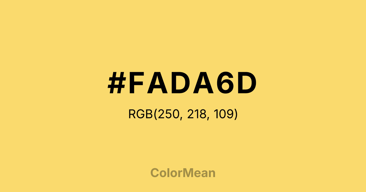 #FADA6D RGB value is (250, 218, 109). The hex color red value is 250, green is 218, and blue is 109. Its HSL format shows a hue of 46°, saturation of 93 percent, and lightness of 70 percent. The CMYK process values are 0 percent, 13 percent, 56 percent, 2 percent.