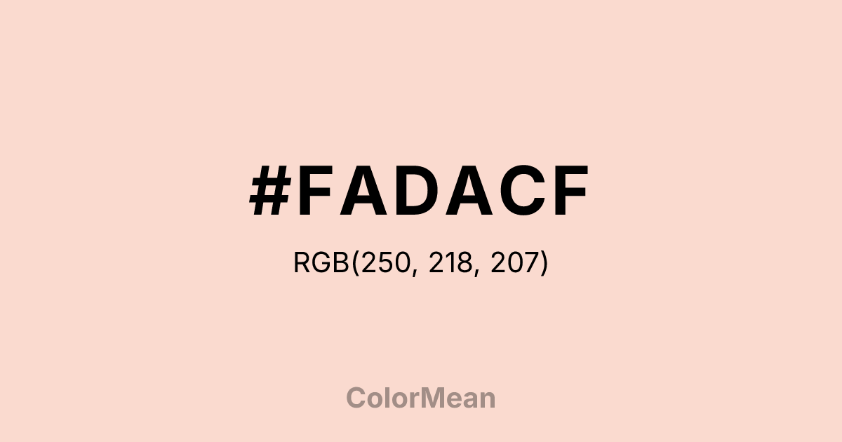 #FADACF RGB value is (250, 218, 207). The hex color red value is 250, green is 218, and blue is 207. Its HSL format shows a hue of 15°, saturation of 81 percent, and lightness of 90 percent. The CMYK process values are 0 percent, 13 percent, 17 percent, 2 percent.