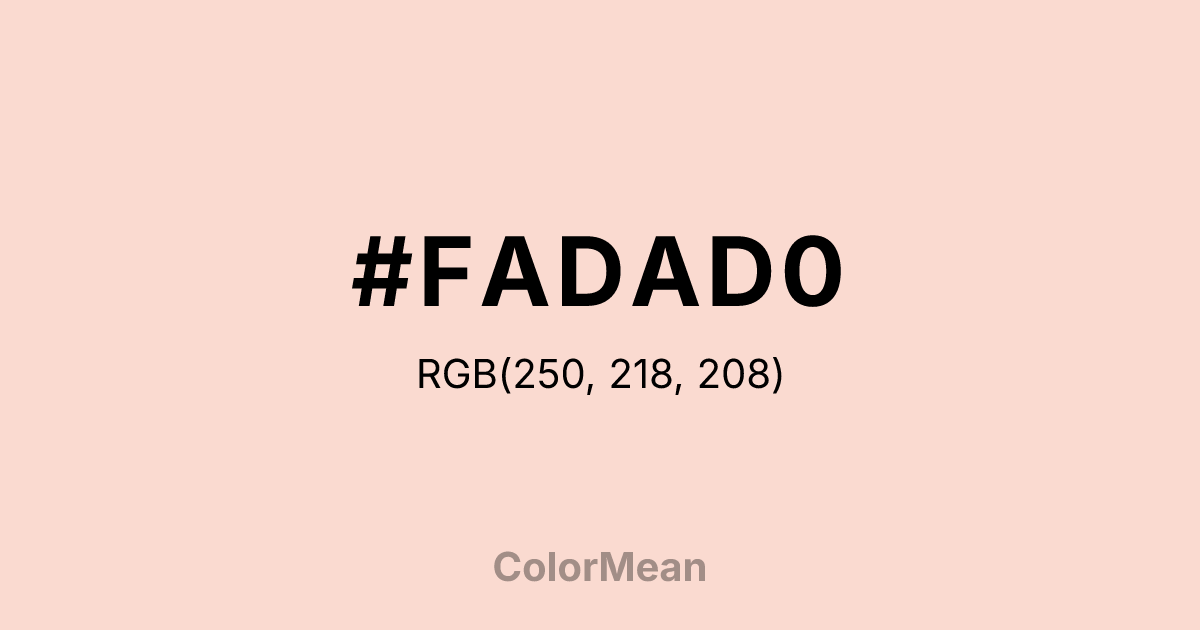 #FADAD0 RGB value is (250, 218, 208). The hex color red value is 250, green is 218, and blue is 208. Its HSL format shows a hue of 14°, saturation of 81 percent, and lightness of 90 percent. The CMYK process values are 0 percent, 13 percent, 17 percent, 2 percent.