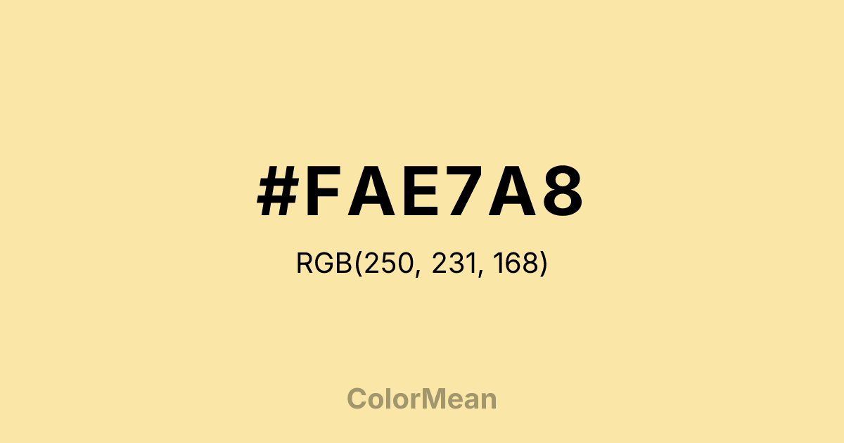 #FAE7A8 RGB value is (250, 231, 168). The hex color red value is 250, green is 231, and blue is 168. Its HSL format shows a hue of 46°, saturation of 89 percent, and lightness of 82 percent. The CMYK process values are 0 percent, 8 percent, 33 percent, 2 percent.