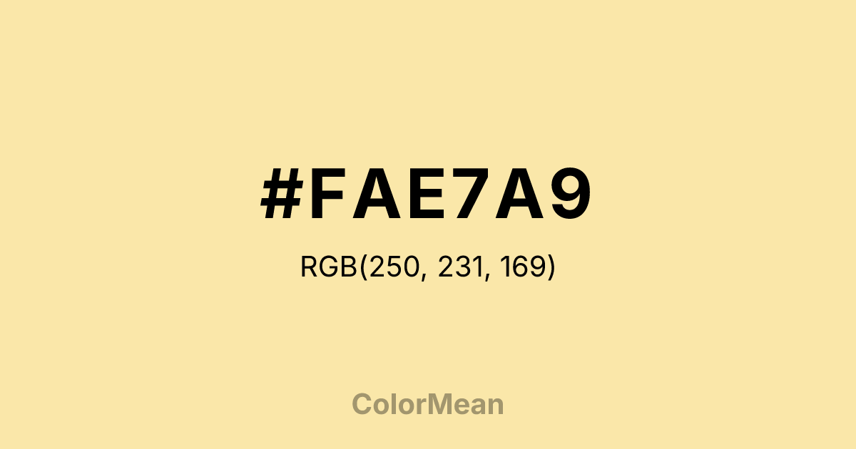 #FAE7A9 RGB value is (250, 231, 169). The hex color red value is 250, green is 231, and blue is 169. Its HSL format shows a hue of 46°, saturation of 89 percent, and lightness of 82 percent. The CMYK process values are 0 percent, 8 percent, 32 percent, 2 percent.