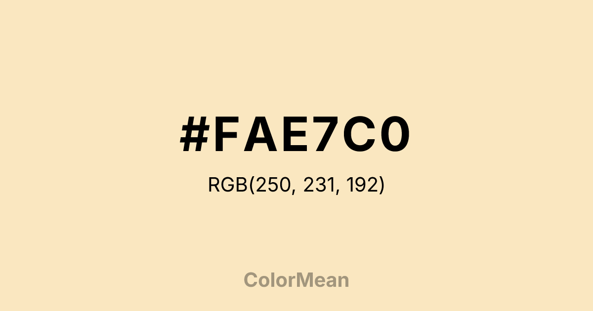 #FAE7C0 RGB value is (250, 231, 192). The hex color red value is 250, green is 231, and blue is 192. Its HSL format shows a hue of 40°, saturation of 85 percent, and lightness of 87 percent. The CMYK process values are 0 percent, 8 percent, 23 percent, 2 percent.