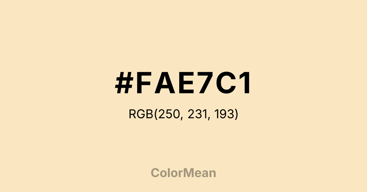 #FAE7C1 RGB value is (250, 231, 193). The hex color red value is 250, green is 231, and blue is 193. Its HSL format shows a hue of 40°, saturation of 85 percent, and lightness of 87 percent. The CMYK process values are 0 percent, 8 percent, 23 percent, 2 percent.
