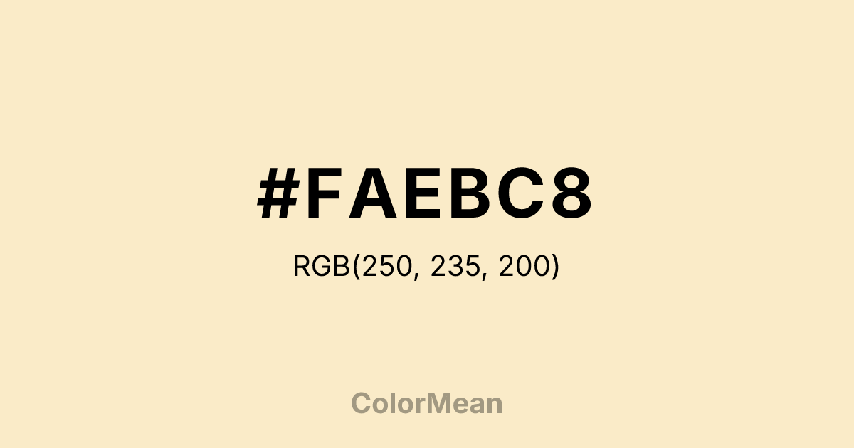 #FAEBC8 RGB value is (250, 235, 200). The hex color red value is 250, green is 235, and blue is 200. Its HSL format shows a hue of 42°, saturation of 83 percent, and lightness of 88 percent. The CMYK process values are 0 percent, 6 percent, 20 percent, 2 percent.