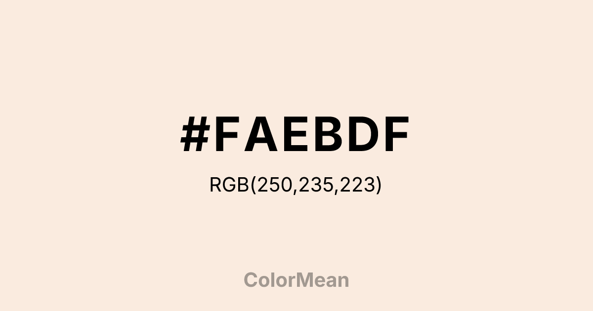#FAEBDF RGB value is (250, 235, 223). The hex color red value is 250, green is 235, and blue is 223. Its HSL format shows a hue of 27°, saturation of 73 percent, and lightness of 93 percent. The CMYK process values are 0 percent, 6 percent, 11 percent, 2 percent.