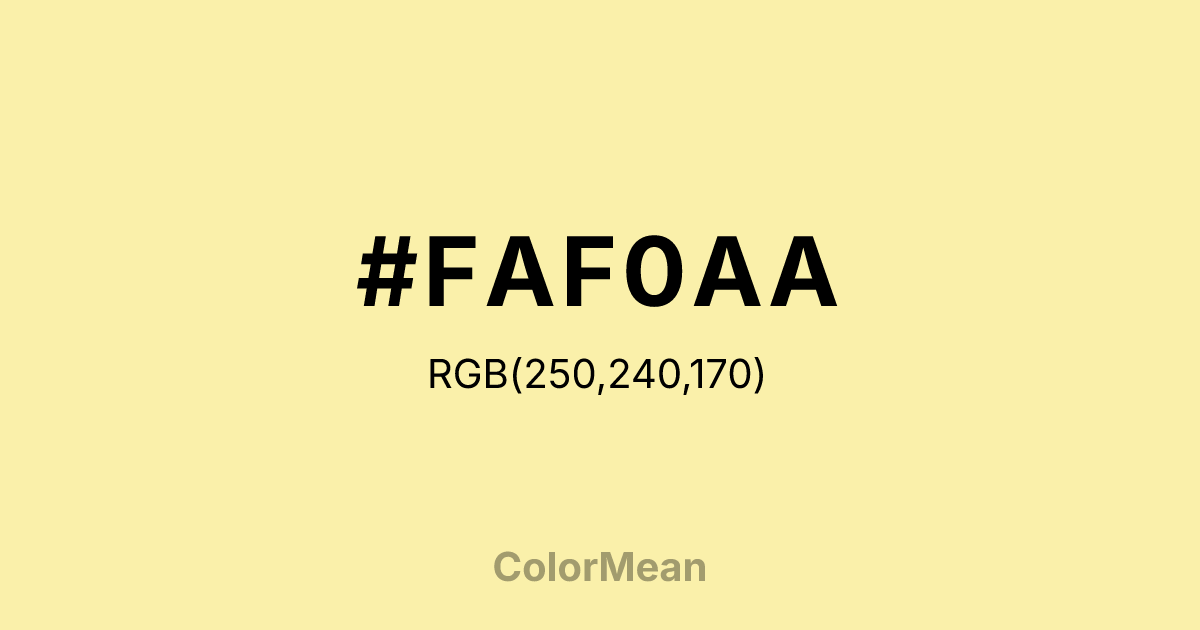 #FAF0AA RGB value is (250, 240, 170). The hex color red value is 250, green is 240, and blue is 170. Its HSL format shows a hue of 53°, saturation of 89 percent, and lightness of 82 percent. The CMYK process values are 0 percent, 4 percent, 32 percent, 2 percent.