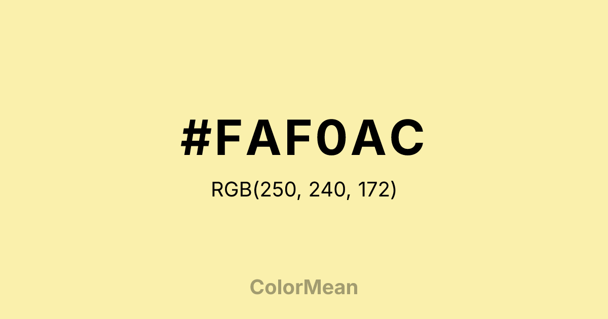 #FAF0AC RGB value is (250, 240, 172). The hex color red value is 250, green is 240, and blue is 172. Its HSL format shows a hue of 52°, saturation of 89 percent, and lightness of 83 percent. The CMYK process values are 0 percent, 4 percent, 31 percent, 2 percent.