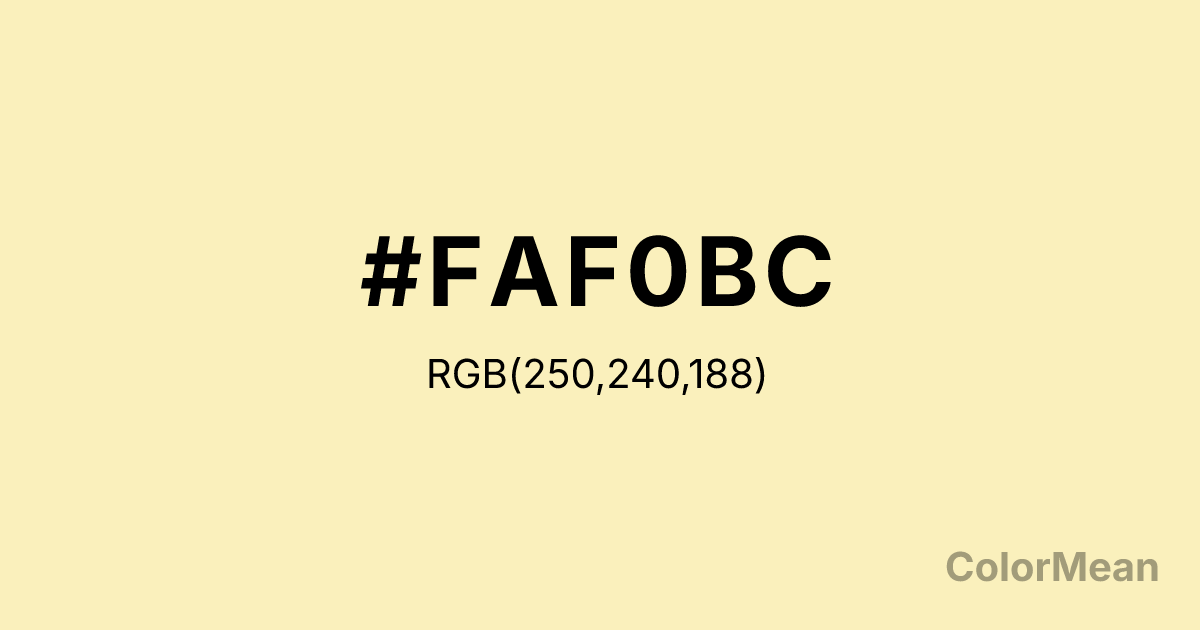 #FAF0BC RGB value is (250, 240, 188). The hex color red value is 250, green is 240, and blue is 188. Its HSL format shows a hue of 50°, saturation of 86 percent, and lightness of 86 percent. The CMYK process values are 0 percent, 4 percent, 25 percent, 2 percent.