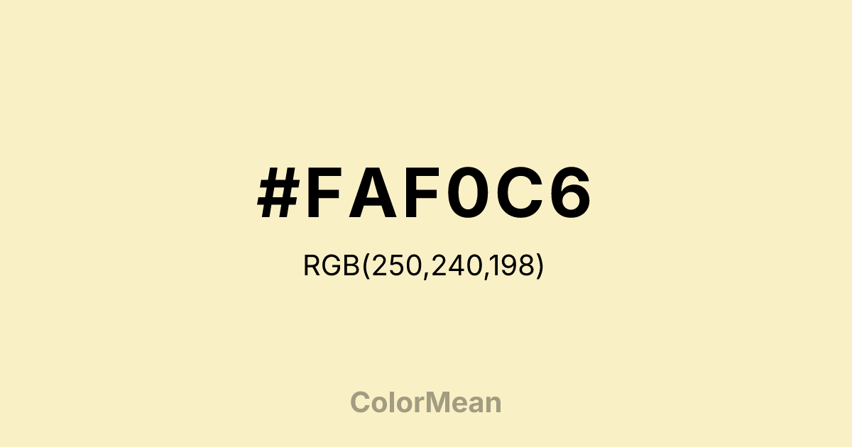 #FAF0C6 RGB value is (250, 240, 198). The hex color red value is 250, green is 240, and blue is 198. Its HSL format shows a hue of 48°, saturation of 84 percent, and lightness of 88 percent. The CMYK process values are 0 percent, 4 percent, 21 percent, 2 percent.
