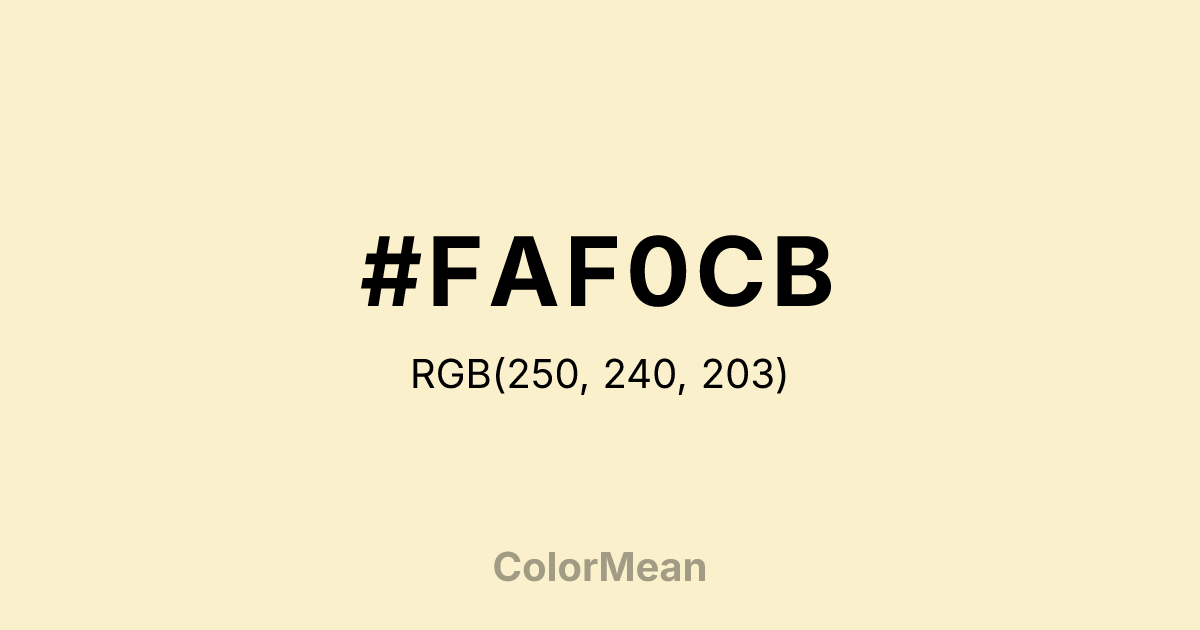 #FAF0CB RGB value is (250, 240, 203). The hex color red value is 250, green is 240, and blue is 203. Its HSL format shows a hue of 47°, saturation of 82 percent, and lightness of 89 percent. The CMYK process values are 0 percent, 4 percent, 19 percent, 2 percent.
