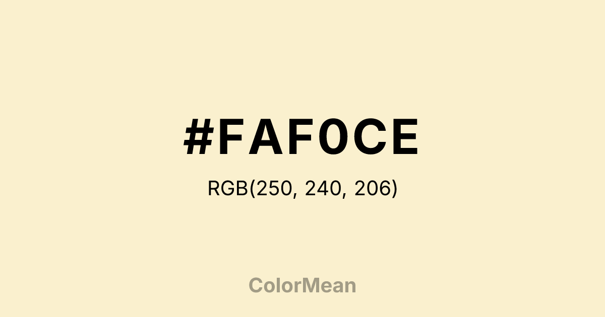 #FAF0CE RGB value is (250, 240, 206). The hex color red value is 250, green is 240, and blue is 206. Its HSL format shows a hue of 46°, saturation of 81 percent, and lightness of 89 percent. The CMYK process values are 0 percent, 4 percent, 18 percent, 2 percent.