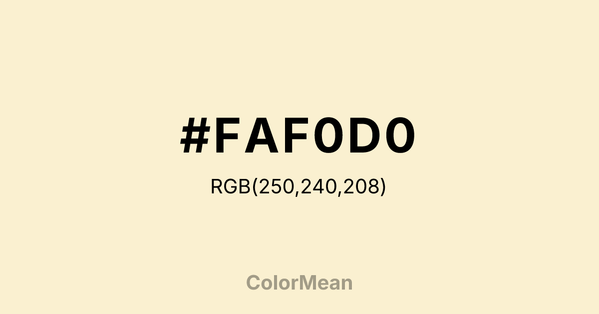 #FAF0D0 RGB value is (250, 240, 208). The hex color red value is 250, green is 240, and blue is 208. Its HSL format shows a hue of 46°, saturation of 81 percent, and lightness of 90 percent. The CMYK process values are 0 percent, 4 percent, 17 percent, 2 percent.
