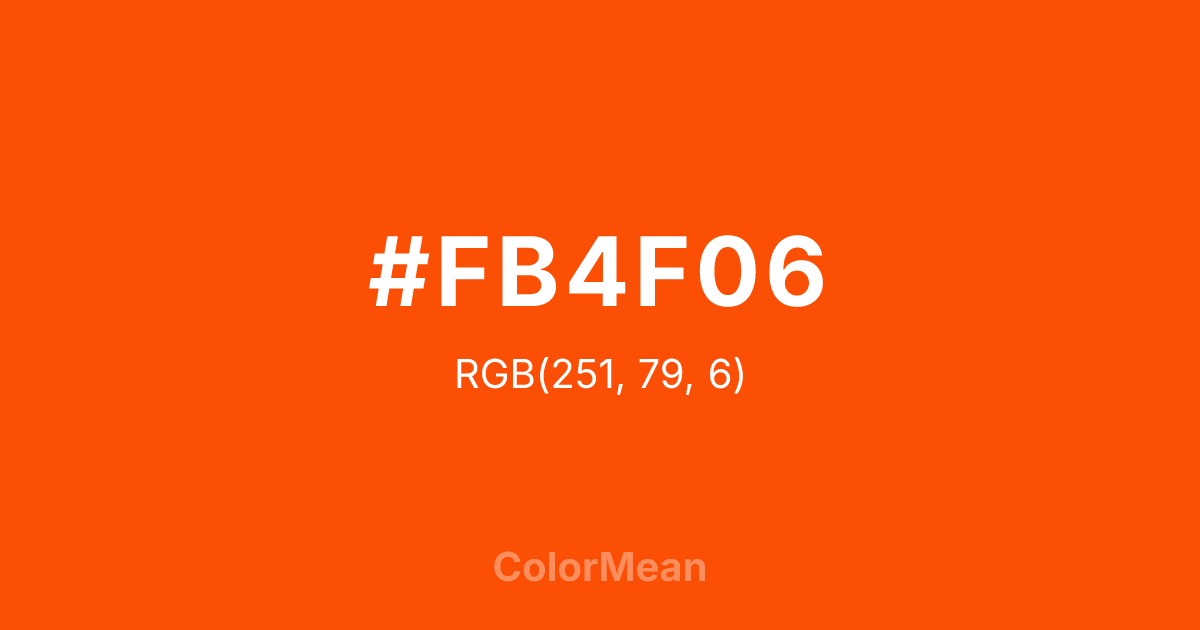 #FB4F06 RGB value is (251, 79, 6). The hex color red value is 251, green is 79, and blue is 6. Its HSL format shows a hue of 18°, saturation of 97 percent, and lightness of 50 percent. The CMYK process values are 0 percent, 69 percent, 98 percent, 2 percent.
