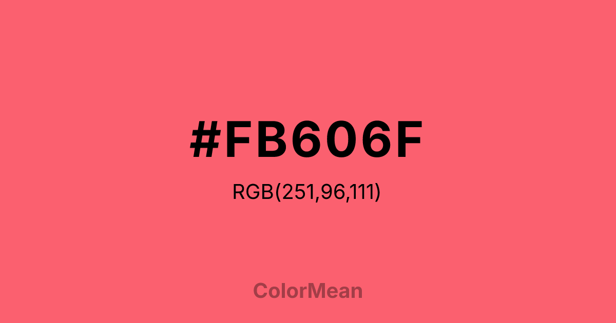 #FB606F RGB value is (251, 96, 111). The hex color red value is 251, green is 96, and blue is 111. Its HSL format shows a hue of 354°, saturation of 95 percent, and lightness of 68 percent. The CMYK process values are 0 percent, 62 percent, 56 percent, 2 percent.