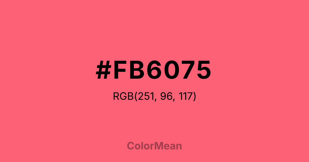 #FB6075 RGB value is (251, 96, 117). The hex color red value is 251, green is 96, and blue is 117. Its HSL format shows a hue of 352°, saturation of 95 percent, and lightness of 68 percent. The CMYK process values are 0 percent, 62 percent, 53 percent, 2 percent.