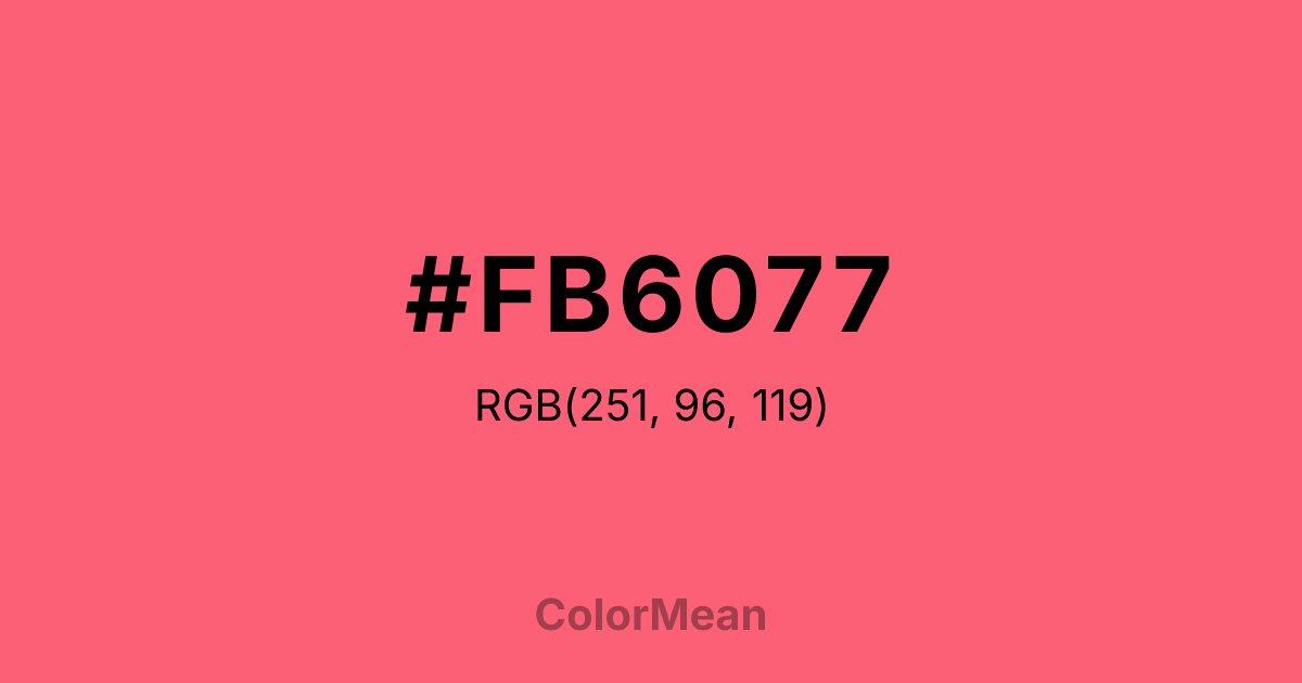#FB6077 RGB value is (251, 96, 119). The hex color red value is 251, green is 96, and blue is 119. Its HSL format shows a hue of 351°, saturation of 95 percent, and lightness of 68 percent. The CMYK process values are 0 percent, 62 percent, 53 percent, 2 percent.
