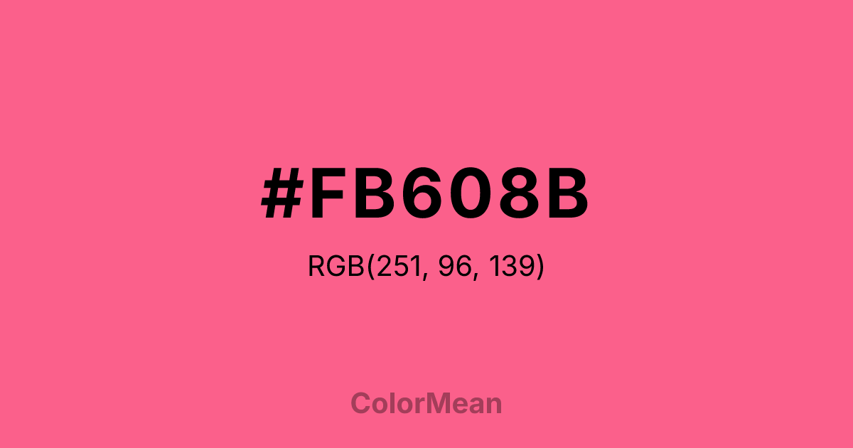 #FB608B RGB value is (251, 96, 139). The hex color red value is 251, green is 96, and blue is 139. Its HSL format shows a hue of 343°, saturation of 95 percent, and lightness of 68 percent. The CMYK process values are 0 percent, 62 percent, 45 percent, 2 percent.