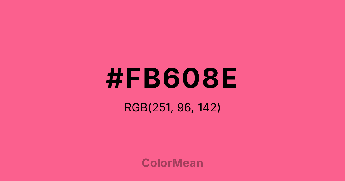 #FB608E RGB value is (251, 96, 142). The hex color red value is 251, green is 96, and blue is 142. Its HSL format shows a hue of 342°, saturation of 95 percent, and lightness of 68 percent. The CMYK process values are 0 percent, 62 percent, 43 percent, 2 percent.