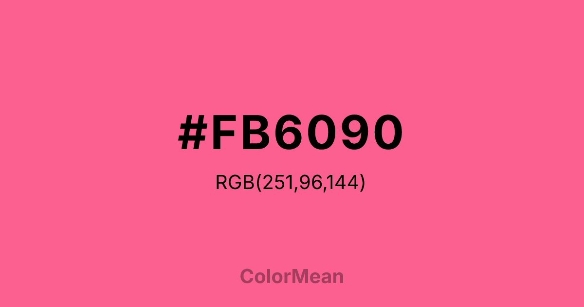 #FB6090 RGB value is (251, 96, 144). The hex color red value is 251, green is 96, and blue is 144. Its HSL format shows a hue of 341°, saturation of 95 percent, and lightness of 68 percent. The CMYK process values are 0 percent, 62 percent, 43 percent, 2 percent.