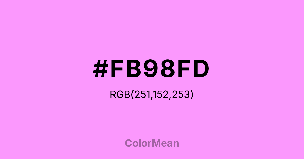 #FB98FD RGB value is (251, 152, 253). The hex color red value is 251, green is 152, and blue is 253. Its HSL format shows a hue of 299°, saturation of 96 percent, and lightness of 79 percent. The CMYK process values are 1 percent, 40 percent, 0 percent, 1 percent.