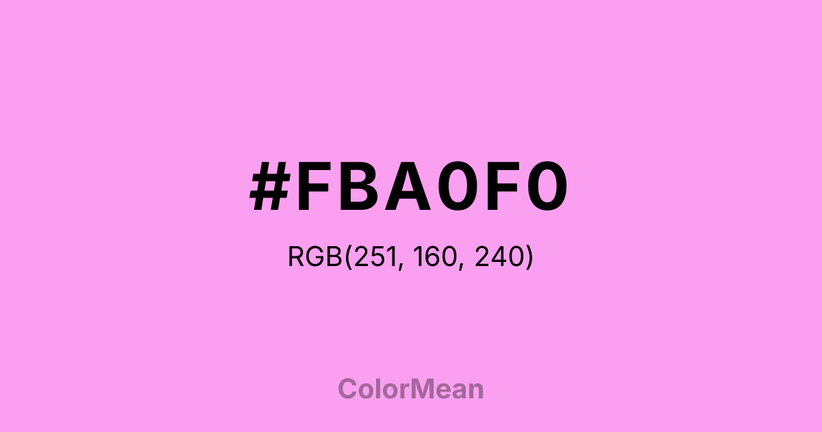 #FBA0F0 RGB value is (251, 160, 240). The hex color red value is 251, green is 160, and blue is 240. Its HSL format shows a hue of 307°, saturation of 92 percent, and lightness of 81 percent. The CMYK process values are 0 percent, 36 percent, 4 percent, 2 percent.
