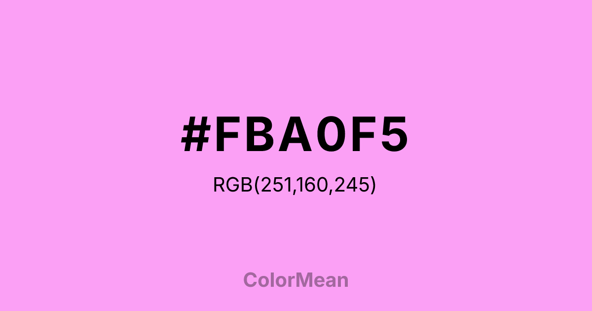 #FBA0F5 RGB value is (251, 160, 245). The hex color red value is 251, green is 160, and blue is 245. Its HSL format shows a hue of 304°, saturation of 92 percent, and lightness of 81 percent. The CMYK process values are 0 percent, 36 percent, 2 percent, 2 percent.