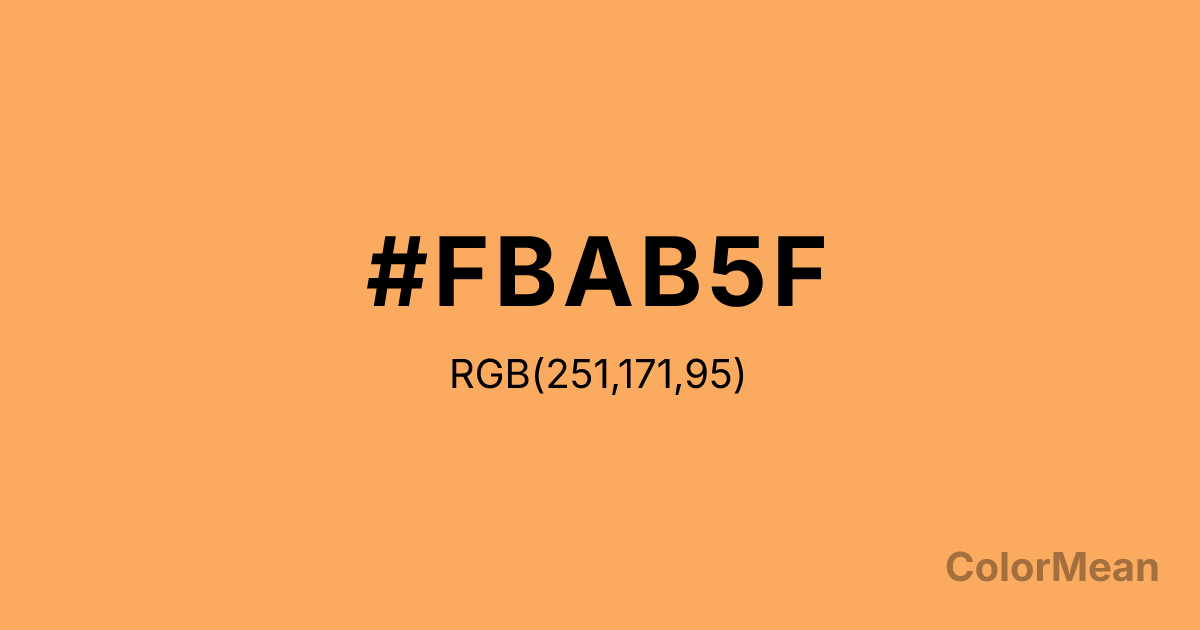 #FBAB5F RGB value is (251, 171, 95). The hex color red value is 251, green is 171, and blue is 95. Its HSL format shows a hue of 29°, saturation of 95 percent, and lightness of 68 percent. The CMYK process values are 0 percent, 32 percent, 62 percent, 2 percent.