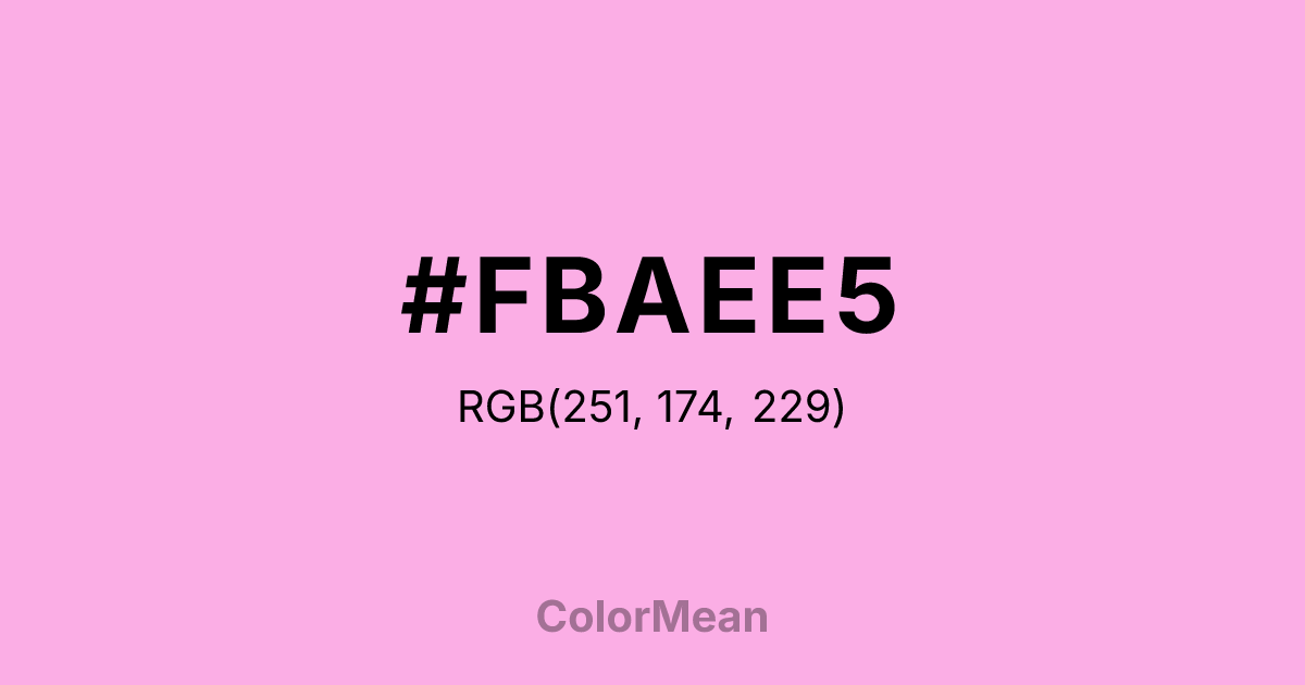 #FBAEE5 RGB value is (251, 174, 229). The hex color red value is 251, green is 174, and blue is 229. Its HSL format shows a hue of 317°, saturation of 91 percent, and lightness of 83 percent. The CMYK process values are 0 percent, 31 percent, 9 percent, 2 percent.