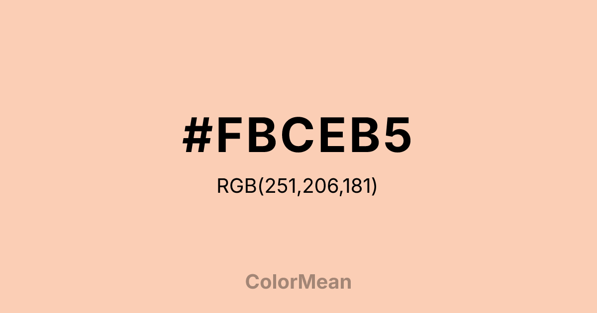 #FBCEB5 RGB value is (251, 206, 181). The hex color red value is 251, green is 206, and blue is 181. Its HSL format shows a hue of 21°, saturation of 90 percent, and lightness of 85 percent. The CMYK process values are 0 percent, 18 percent, 28 percent, 2 percent.