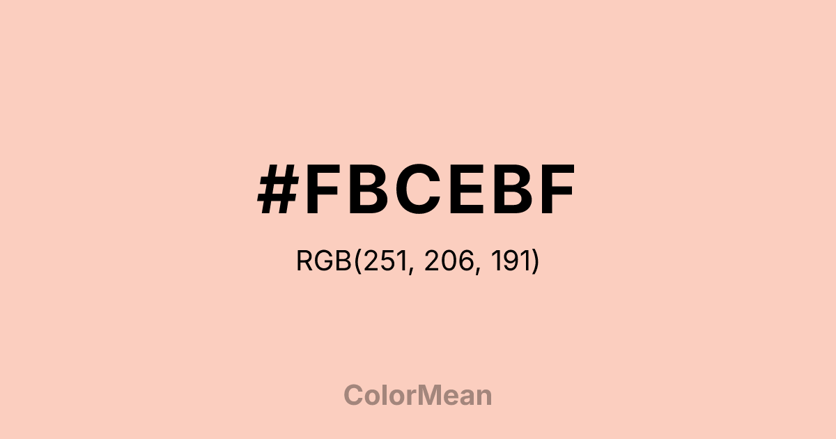#FBCEBF RGB value is (251, 206, 191). The hex color red value is 251, green is 206, and blue is 191. Its HSL format shows a hue of 15°, saturation of 88 percent, and lightness of 87 percent. The CMYK process values are 0 percent, 18 percent, 24 percent, 2 percent.