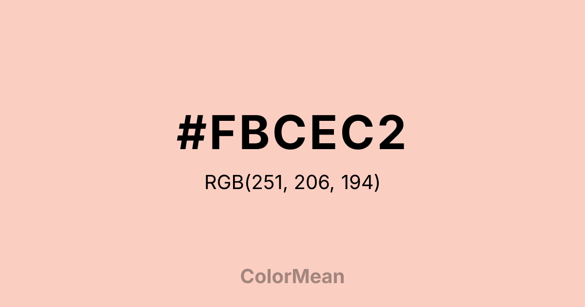 #FBCEC2 RGB value is (251, 206, 194). The hex color red value is 251, green is 206, and blue is 194. Its HSL format shows a hue of 13°, saturation of 88 percent, and lightness of 87 percent. The CMYK process values are 0 percent, 18 percent, 23 percent, 2 percent.