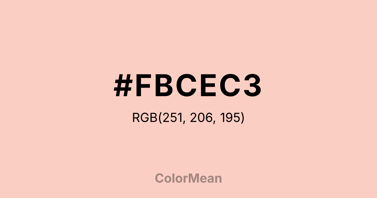 #FBCEC3 RGB value is (251, 206, 195). The hex color red value is 251, green is 206, and blue is 195. Its HSL format shows a hue of 12°, saturation of 88 percent, and lightness of 87 percent. The CMYK process values are 0 percent, 18 percent, 22 percent, 2 percent.