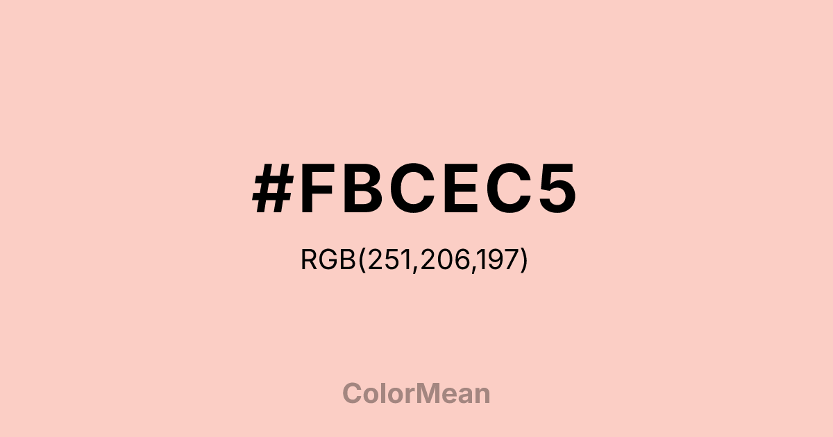 #FBCEC5 RGB value is (251, 206, 197). The hex color red value is 251, green is 206, and blue is 197. Its HSL format shows a hue of 10°, saturation of 87 percent, and lightness of 88 percent. The CMYK process values are 0 percent, 18 percent, 22 percent, 2 percent.