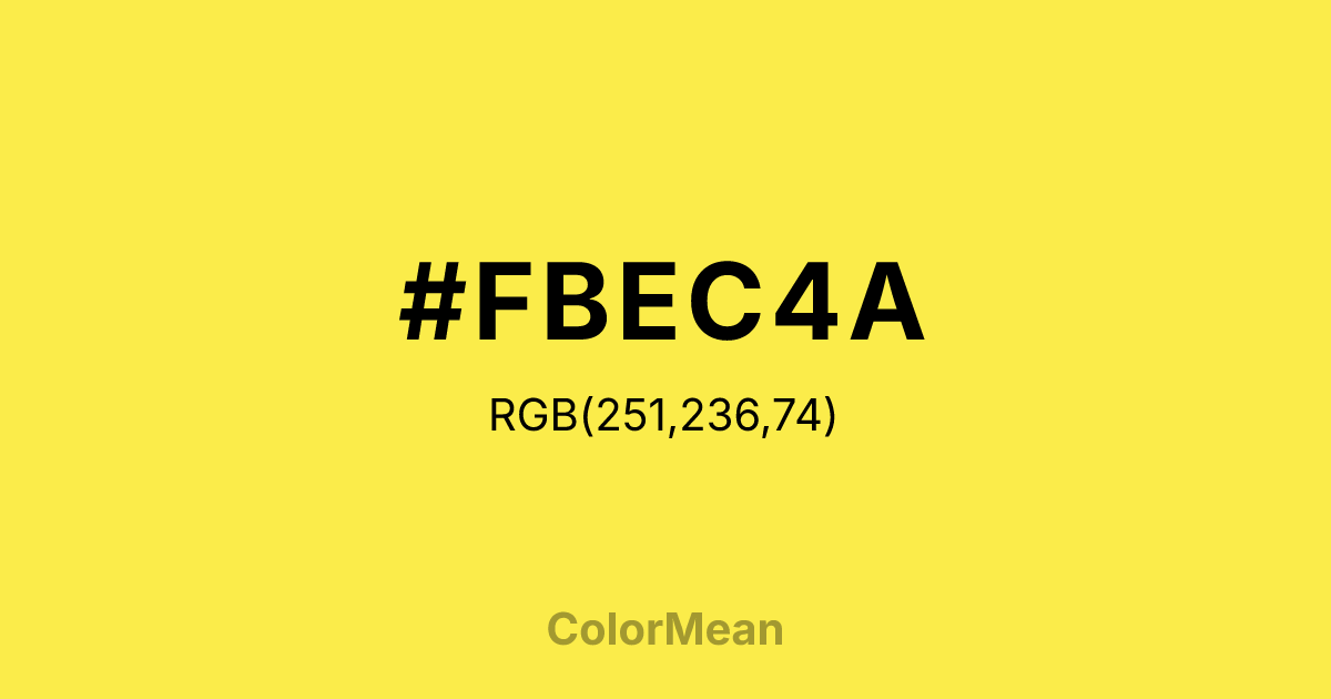 #FBEC4A RGB value is (251, 236, 74). The hex color red value is 251, green is 236, and blue is 74. Its HSL format shows a hue of 55°, saturation of 96 percent, and lightness of 64 percent. The CMYK process values are 0 percent, 6 percent, 71 percent, 2 percent.