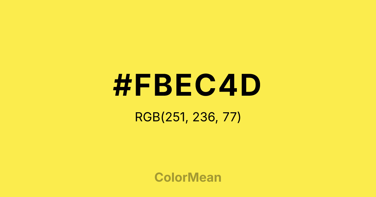 #FBEC4D RGB value is (251, 236, 77). The hex color red value is 251, green is 236, and blue is 77. Its HSL format shows a hue of 55°, saturation of 96 percent, and lightness of 64 percent. The CMYK process values are 0 percent, 6 percent, 69 percent, 2 percent.