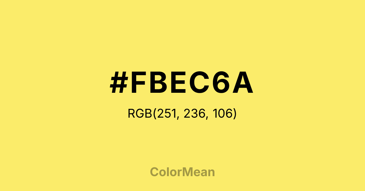 #FBEC6A RGB value is (251, 236, 106). The hex color red value is 251, green is 236, and blue is 106. Its HSL format shows a hue of 54°, saturation of 95 percent, and lightness of 70 percent. The CMYK process values are 0 percent, 6 percent, 58 percent, 2 percent.