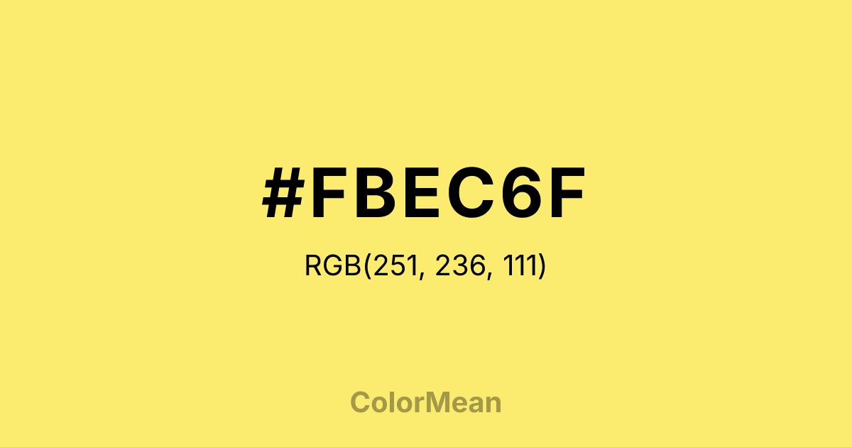 #FBEC6F RGB value is (251, 236, 111). The hex color red value is 251, green is 236, and blue is 111. Its HSL format shows a hue of 54°, saturation of 95 percent, and lightness of 71 percent. The CMYK process values are 0 percent, 6 percent, 56 percent, 2 percent.