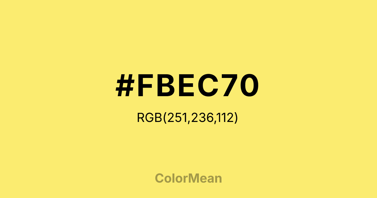 #FBEC70 RGB value is (251, 236, 112). The hex color red value is 251, green is 236, and blue is 112. Its HSL format shows a hue of 54°, saturation of 95 percent, and lightness of 71 percent. The CMYK process values are 0 percent, 6 percent, 55 percent, 2 percent.