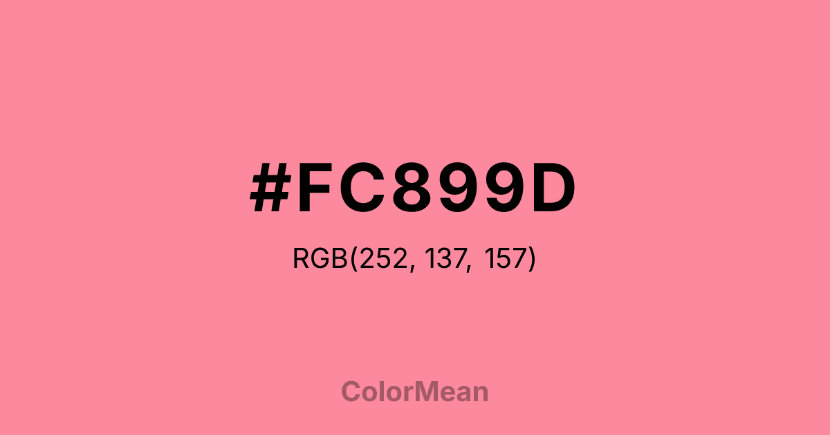 #FC899D RGB value is (252, 137, 157). The hex color red value is 252, green is 137, and blue is 157. Its HSL format shows a hue of 350°, saturation of 95 percent, and lightness of 76 percent. The CMYK process values are 0 percent, 46 percent, 38 percent, 1 percent.
