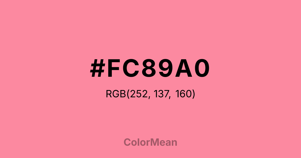 #FC89A0 RGB value is (252, 137, 160). The hex color red value is 252, green is 137, and blue is 160. Its HSL format shows a hue of 348°, saturation of 95 percent, and lightness of 76 percent. The CMYK process values are 0 percent, 46 percent, 37 percent, 1 percent.