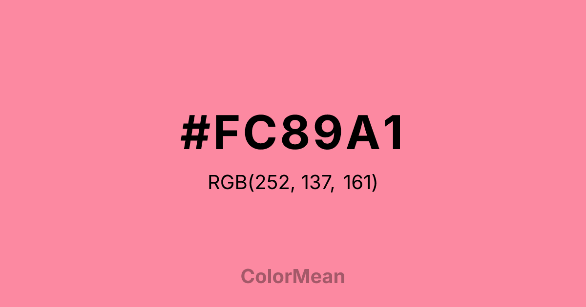 #FC89A1 RGB value is (252, 137, 161). The hex color red value is 252, green is 137, and blue is 161. Its HSL format shows a hue of 347°, saturation of 95 percent, and lightness of 76 percent. The CMYK process values are 0 percent, 46 percent, 36 percent, 1 percent.