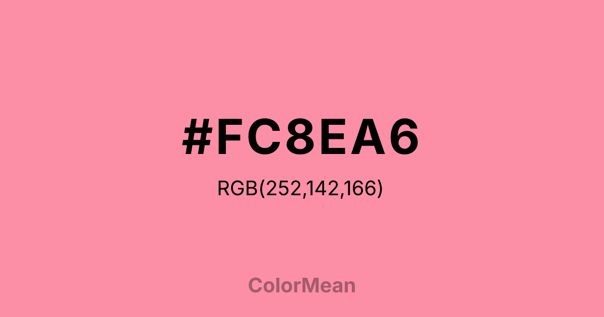#FC8EA6 RGB value is (252, 142, 166). The hex color red value is 252, green is 142, and blue is 166. Its HSL format shows a hue of 347°, saturation of 95 percent, and lightness of 77 percent. The CMYK process values are 0 percent, 44 percent, 34 percent, 1 percent.