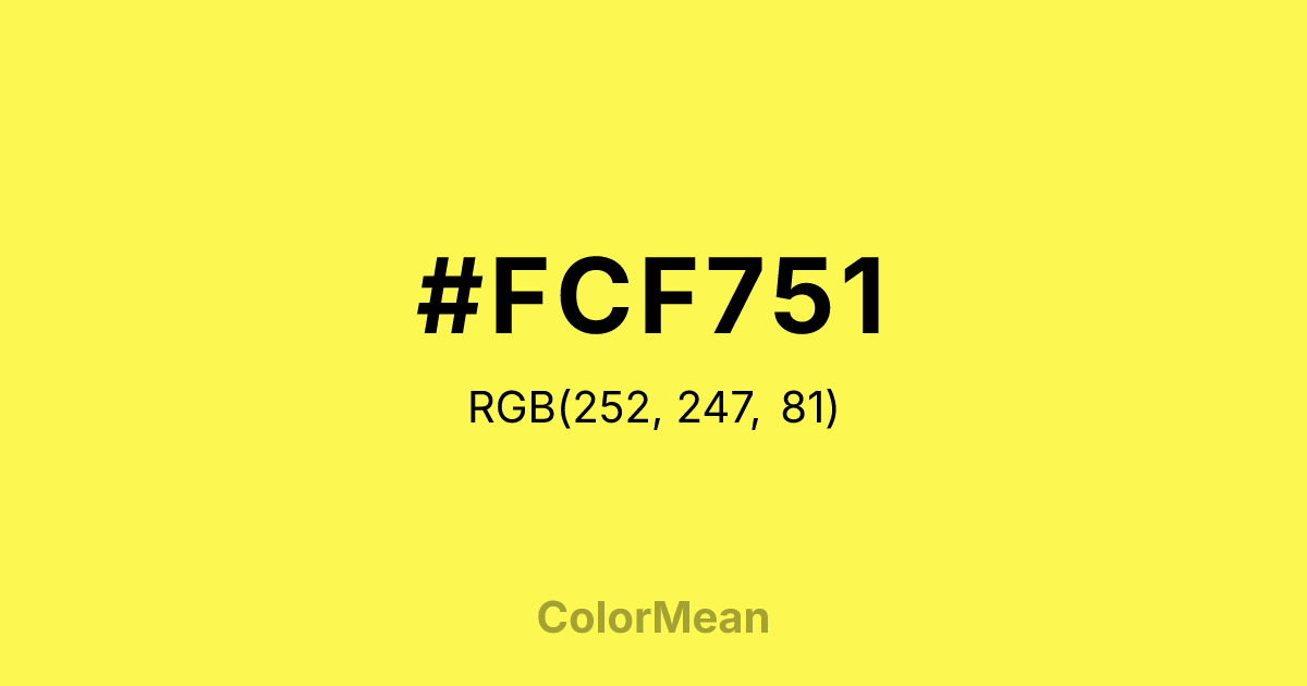#FCF751 RGB value is (252, 247, 81). The hex color red value is 252, green is 247, and blue is 81. Its HSL format shows a hue of 58°, saturation of 97 percent, and lightness of 65 percent. The CMYK process values are 0 percent, 2 percent, 68 percent, 1 percent.