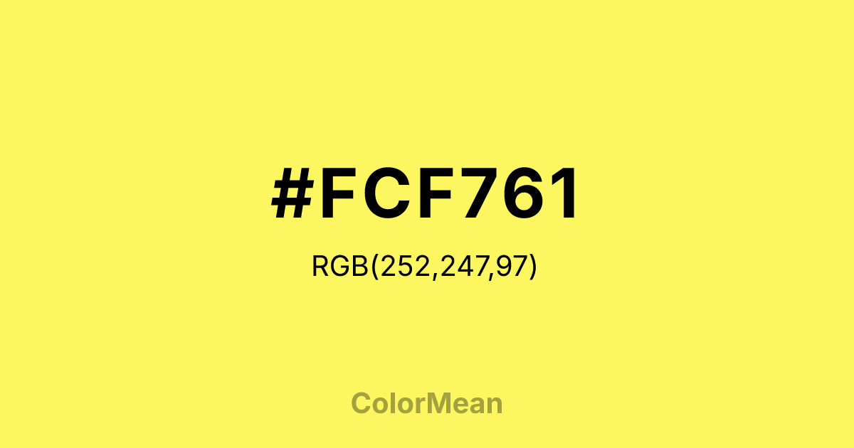 #FCF761 RGB value is (252, 247, 97). The hex color red value is 252, green is 247, and blue is 97. Its HSL format shows a hue of 58°, saturation of 96 percent, and lightness of 68 percent. The CMYK process values are 0 percent, 2 percent, 62 percent, 1 percent.