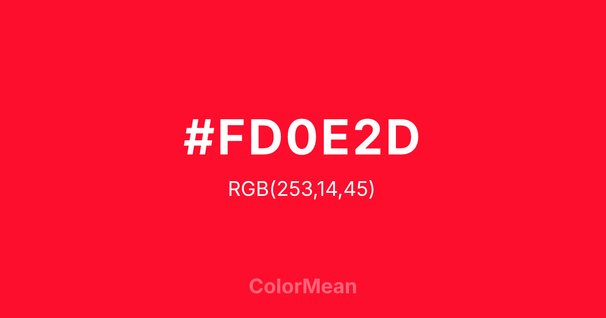 #FD0E2D RGB value is (253, 14, 45). The hex color red value is 253, green is 14, and blue is 45. Its HSL format shows a hue of 352°, saturation of 98 percent, and lightness of 52 percent. The CMYK process values are 0 percent, 94 percent, 82 percent, 1 percent.