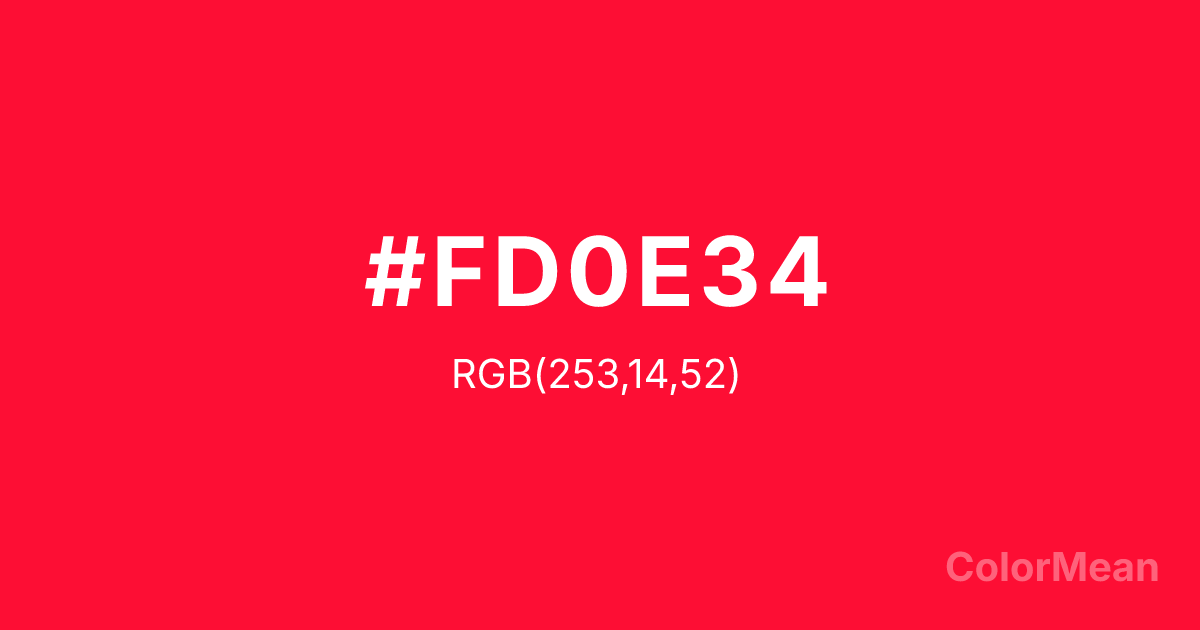 #FD0E34 RGB value is (253, 14, 52). The hex color red value is 253, green is 14, and blue is 52. Its HSL format shows a hue of 350°, saturation of 98 percent, and lightness of 52 percent. The CMYK process values are 0 percent, 94 percent, 79 percent, 1 percent.