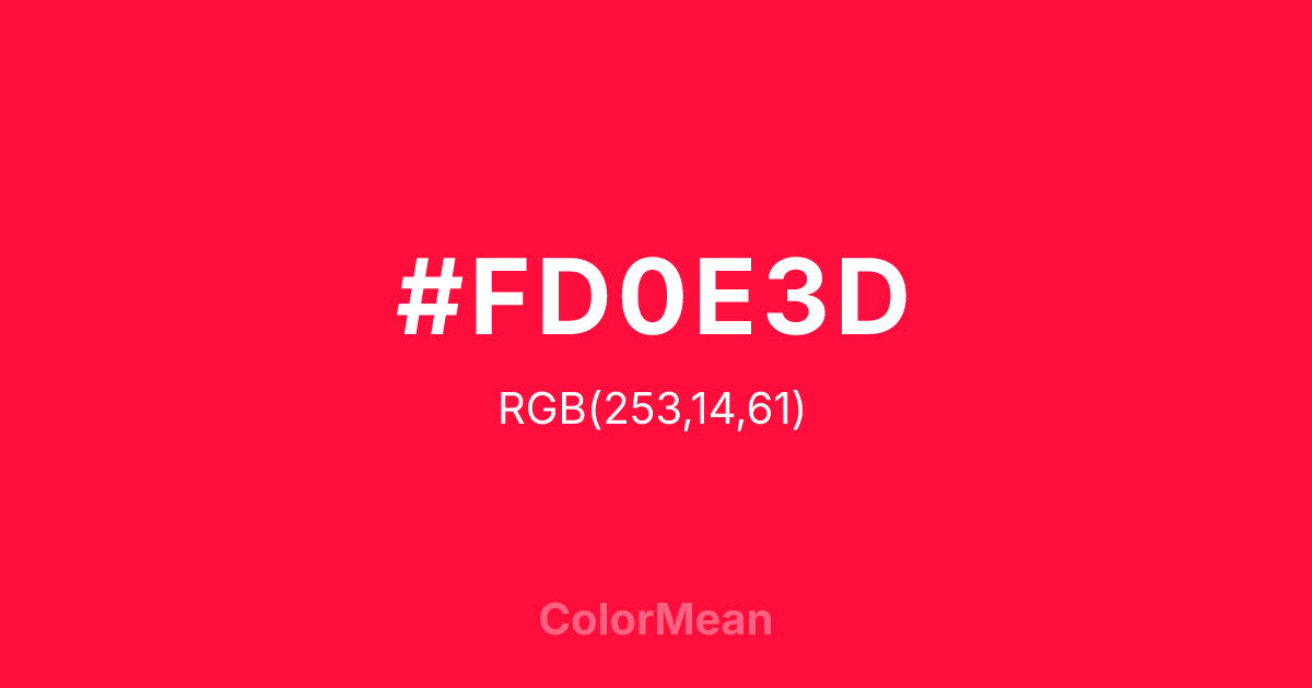#FD0E3D RGB value is (253, 14, 61). The hex color red value is 253, green is 14, and blue is 61. Its HSL format shows a hue of 348°, saturation of 98 percent, and lightness of 52 percent. The CMYK process values are 0 percent, 94 percent, 76 percent, 1 percent.