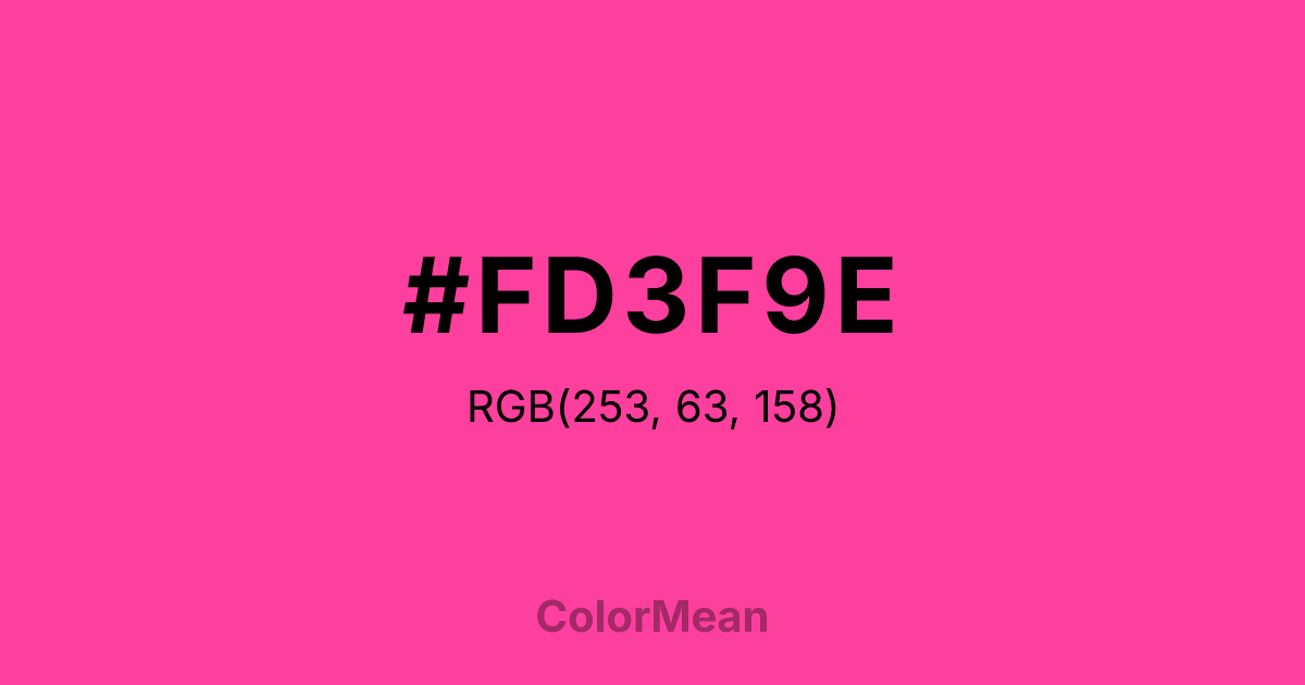 #FD3F9E RGB value is (253, 63, 158). The hex color red value is 253, green is 63, and blue is 158. Its HSL format shows a hue of 330°, saturation of 98 percent, and lightness of 62 percent. The CMYK process values are 0 percent, 75 percent, 38 percent, 1 percent.