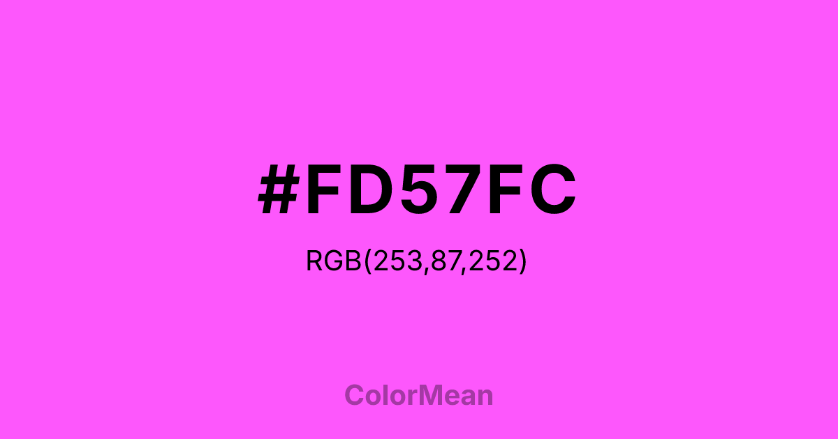 #FD57FC RGB value is (253, 87, 252). The hex color red value is 253, green is 87, and blue is 252. Its HSL format shows a hue of 300°, saturation of 98 percent, and lightness of 67 percent. The CMYK process values are 0 percent, 66 percent, 0 percent, 1 percent.
