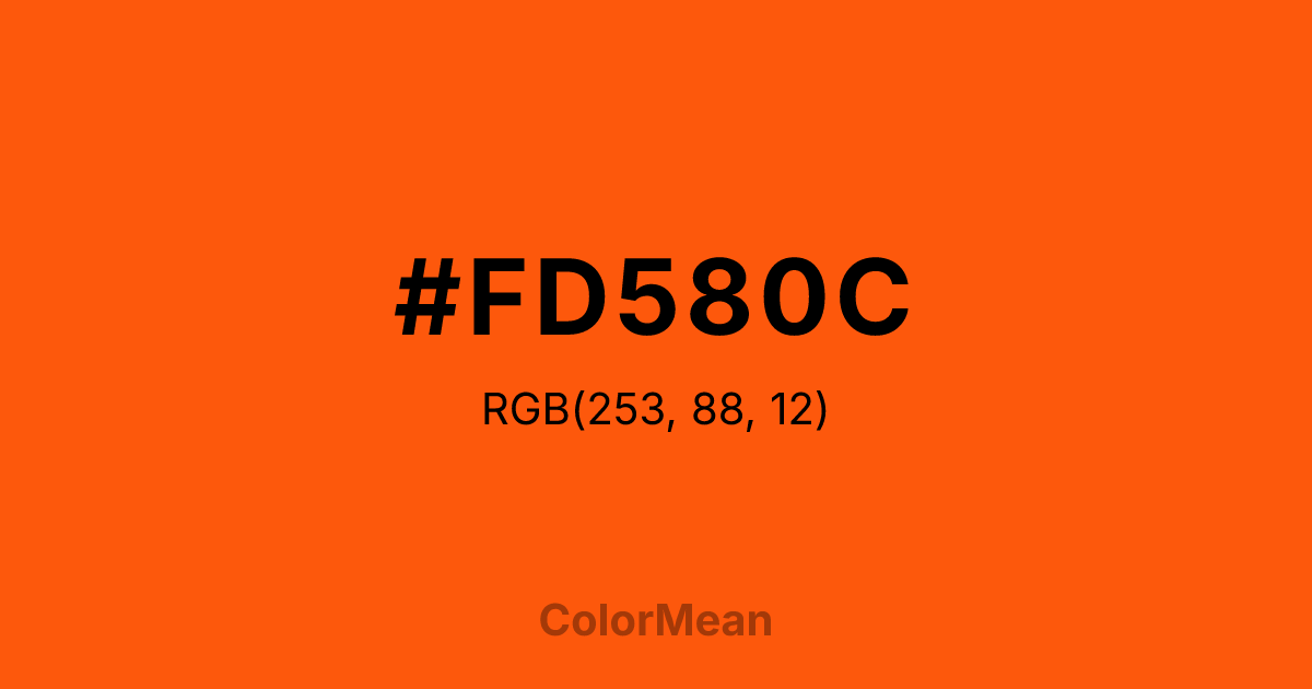#FD580C RGB value is (253, 88, 12). The hex color red value is 253, green is 88, and blue is 12. Its HSL format shows a hue of 19°, saturation of 98 percent, and lightness of 52 percent. The CMYK process values are 0 percent, 65 percent, 95 percent, 1 percent.
